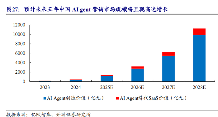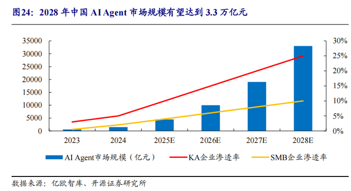 根据亿欧智库测算,2024年中国AI Agent营销及销售市场规模约442亿元,一方面AI Agent将逐步提升SaaS的服务价值,另一方面AI Agent的定制化功能开发需求显著增长,预计未来五年将呈现高速增长,达到万亿级市场空间。