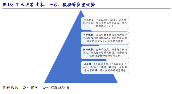 T云的核心优势体现在:(1)预算优势:T云SaaS化的部署,资源集团化采购,降低了整体运营成本,可以让利给更多企业。(2)平台优势:PaaS中台支持快速增加符合市场需求的新功能板块,帮用户抢占新渠道的流量入口,抓住热点红利。(3)数据优势:全布局埋点,海量行业数据沉淀,形成行业专属大模型,为企业提供数据分析和行业精准建议。(4)AI工具:T云提供多种AI工具提升员工人效,如臻文、臻图、臻视等,分别用于内容撰写、图片生成和视频剪辑等。目前我国中小微企业数量超过5300万家,而截至2024年底公司AI+SaaS业务的总付费用户数仅2.66万家,T云业务仍面临着广阔的市场空间。