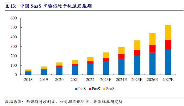 中国SaaS市场仍处于快速发展期。根据弗若斯特沙利文的资料,在2022年,按收入计算,中国SaaS市场规模从2018年的164亿元增长至443亿元,2018年至2022年的复合年增长率为28.2%。在需求持续增长、产品功能不断完善以及政府对数字经济的利好政策推动下,预计中国SaaS市场规模在2027年将达到1556亿元,2022年至2027年的复合年增长率为28.6%。此外,PaaS市场是公有云市场增长的另一个重要推动因素,越来越多的SaaS提供商拓展其PaaS服务,因为PaaS能为他们的客户带来附加价值。借助作为低代码工具包的 PaaS 平台,企业能够以更高的敏捷性、更短的开发周期开发定制应用程序,且所需的IT工程师数量更少。
