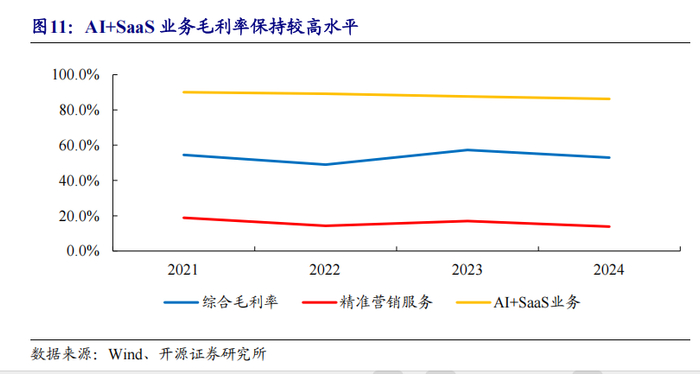 公司营业总收入保持较快增长。公司营业总收入从2021年的8.77亿元增长至2023年12.32亿元,并进一步增长26.5%至2024年的15.59亿元,三年复合增长率为21.1%,整体保持较快增长。从收入结构来看,公司收入主要来源于AI+SaaS业务及精准营销服务,并且AI+SaaS业务收入占比逐渐上升。