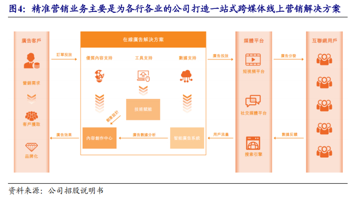 (2)精准营销业务主要是为各行各业的公司打造一站式跨媒体线上营销解决方案,涵盖广告活动的设计、发布、监测以及优化等环节,并且将战略重心聚焦于头部媒体平台。此外,公司还为广告服务提供商提供在线广告分发服务。在此过程中,公司以代理方而非委托方的身份开展业务,代表广告服务提供商通过他们各自的广告账户,在客户指定的媒体平台上投放广告。公司通过设计、发布、监测及优化广告活动,为各行各业的公司提供一站式跨媒体线上营销解决方案,并将战略重点放在头部媒体平台上。