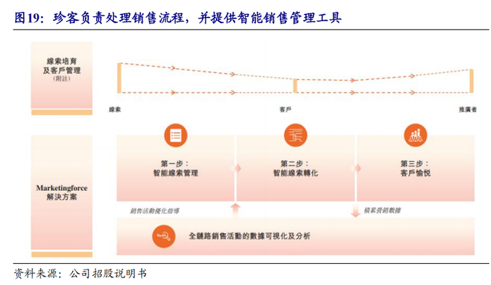 珍客致力于推动大型企业存量客户资产的精细化运营,依托营销中台的智能AI大脑,驱动营销自动化系统,凭借丰富的触达工具,针对存量客户开展“千人千面”的维护工作,提高B2B及B2C企业的客单价和客户粘性,提升客户复购率。珍客负责处理销售流程,并提供智能销售管理工具,涵盖销售线索管理、销售线索转化以及客户管理等方面。具备以下功能:(i)管理客户信息;(ii)与客户进行互动;(iii)提供客户服务;(iv)开展线上客户活动;(v)进行客户数据分析。公司提供多达159个功能模块,其中包括81个与客户关系管理相关的功能模块以及78个辅助模块,以此为不同业务规模和销售团队的用户在整个销售流程中提供支持。珍客的标准版主要助力销售活动的四个阶段,而专业版则进一步配备了辅助模块,可实现客户数据管理以及由人工智能支持的增长自动化等功能,从而满足客户的个性化需求。