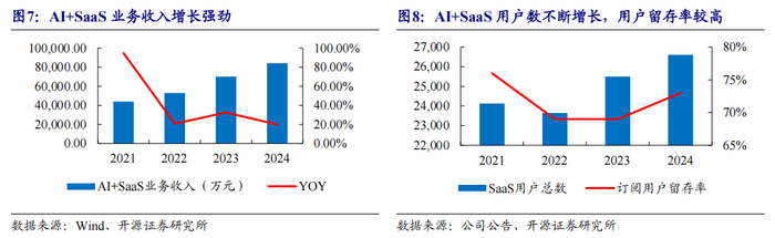 AI+SaaS业务收入增长强劲。公司AI+SaaS业务收入从2021年的4.37亿元增长至2023年7.02亿元,并进一步增长19.9%至2024年的8.42亿元,三年复合增长率为24.3%。2024年末,AI+SaaS业务的用户数量达到26,606名,每名用户每月平均收入为3,848元,较2023年稳步提升。此外,AI+SaaS订阅用户留存率保持较高水平,2024年留存率为73%,较2023年提升4个百分点。