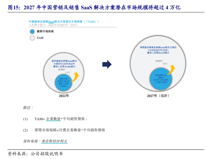 2022-2027年营销及销售SaaS解决方案市场复合年增长率有望达29.3%。根据弗若斯特沙利文的资料,营销及销售SaaS解决方案市场规模从2018年的73亿元增长到 2022 年的 206 亿元,2018 年至 2022 年的复合年增长率为 29.6%。营销及销售 SaaS 解决方案的市场规模预计在 2027 年达到 745 亿元,2022 年至 2027 年的复合年增长率为 29.3%。营销及销售 SaaS解决方案市场在新冠疫情期间展现出了强大的抗风险能力,2021 年至 2022 年该市场的增长速度快于同期整个 SaaS市场的增长速度。