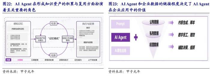 AI Agent成为企业知识资产积累与高效复用中的创新角色。AI Agent能够从企业运营过程中大量繁杂的信息“建立”有价值的企业流程“知识”,形成可查询、可复用的专家级别的企业知识库。更重要的是,AI Agent能够将这些知识资产快速提供给需要的用户或系统,极大地提高了信息的可获取性和应用效率。AI Agent和企业数据的链接程度决定了AI Agent在企业应用中的价值。AI Agent依赖于大量数据进行训练和优化,以提高其智能性和准确性,同时,它们通过与客户的互动收集和分析数据,为企业带来深刻的市场洞察和决策支持。
