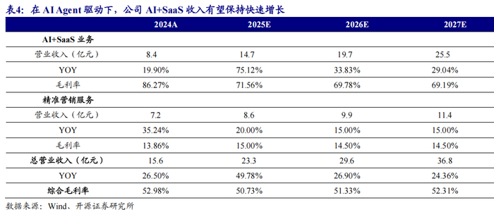 (2)公司精准营销业务有望保持稳健发展,预计2025-2027年精准营销服务收入增速分别为20%、15%、15%。