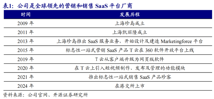 公司是全球领先的营销和销售SaaS平台厂商。公司成立于2009年,总部位于上海市大数据产业基地,2015年公司正式推出一站式营销SaaS产品T云,2021年又推出了一站式销售SaaS产品珍客,2024年公司在港交所上市。目前公司在全球拥有20余家分支机构,累计申请软件著作和专利750余项。