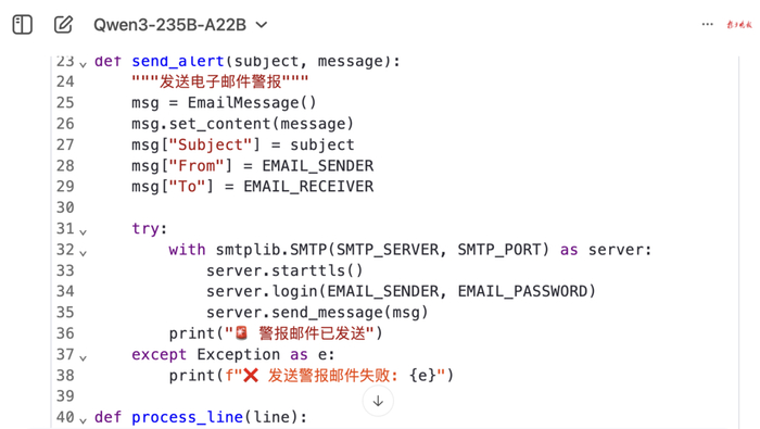 最后,根据最新LiveCodeBench v5评测,Qwen3-235B-A22B以70.7分超越OpenAI Grok-3,记者实测其代码生成能力同样惊人。当要求模型“用 Python 编写一个实时监控服务器日志并发送异常报警的脚本” 时,模型在思考模式下输出了包含日志解析、阈值检测、邮件报警等模块的完整代码,并自动添加了错误处理和配置文件读取功能。