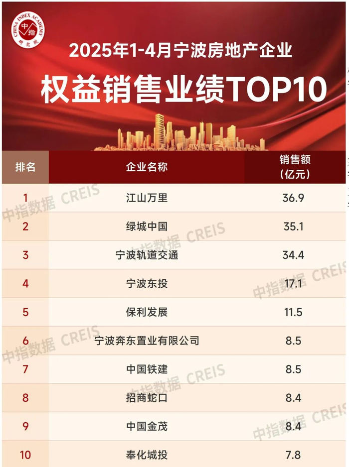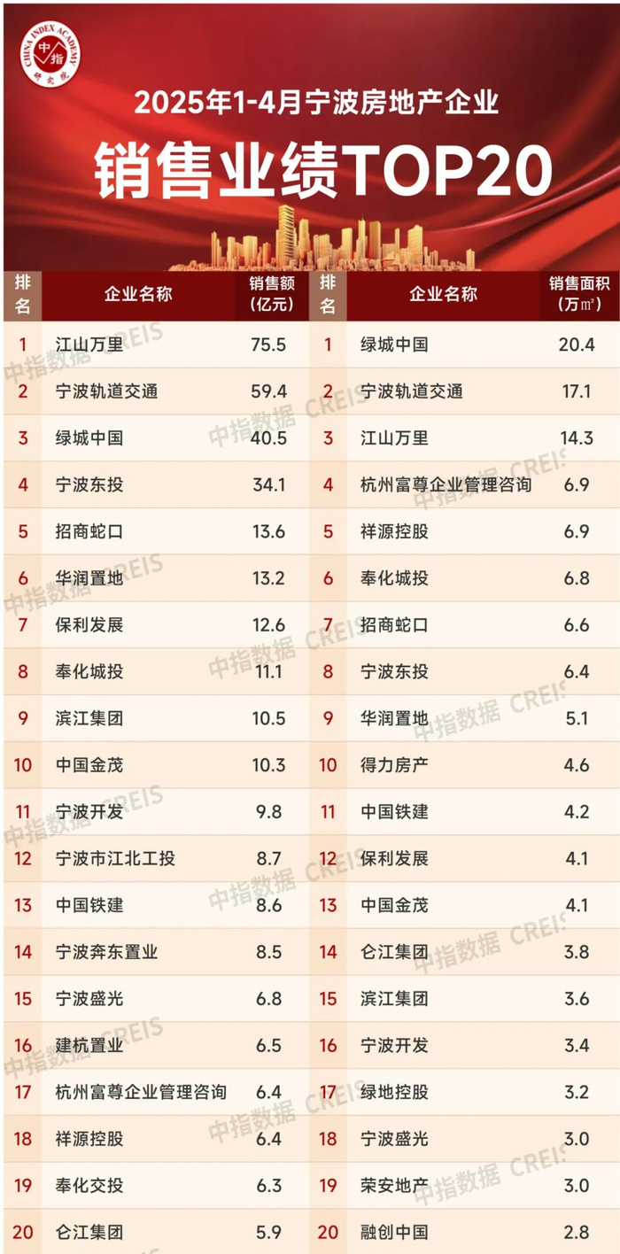 特别声明:宁波房地产企业销售数据统计是以2025年1月1日-4月28日期间销售的全口径商品房为统计口径,主要依据中指数据CREIS(点击查看)在宁波的销售监测数据,并参考当期总体经营情况和推盘去化情况进行分析统计;对于少数没有在监测范围内的项目,由企业提供相关证明文件,经课题组对数据进行严格审核,也纳入统计范围。本报告仅供参考,课题组不对使用报告及其内容所引发的任何直接或间接损失承担责任。