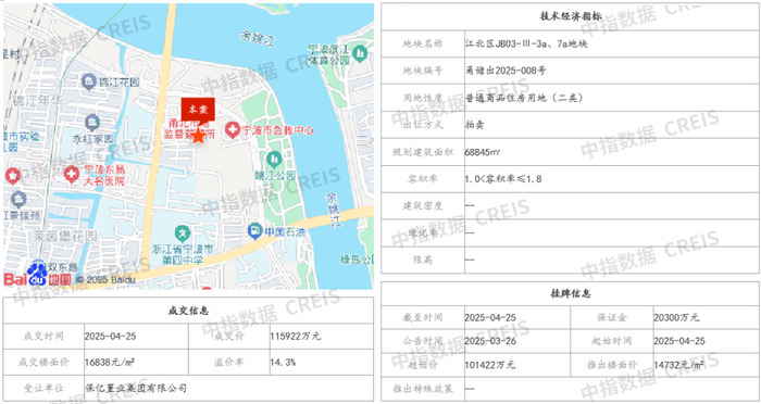 4月25日,江北永红地块开拍,该地块去年有过挂牌,今年重新推出之后,在指标上做了一系列调整,容积率下调至1.8,最低限高12米,并取消幼儿园配建,地块的可塑性提升,最终保亿以溢价率14.3%,总价约11.59亿元拿下江北永红地块。