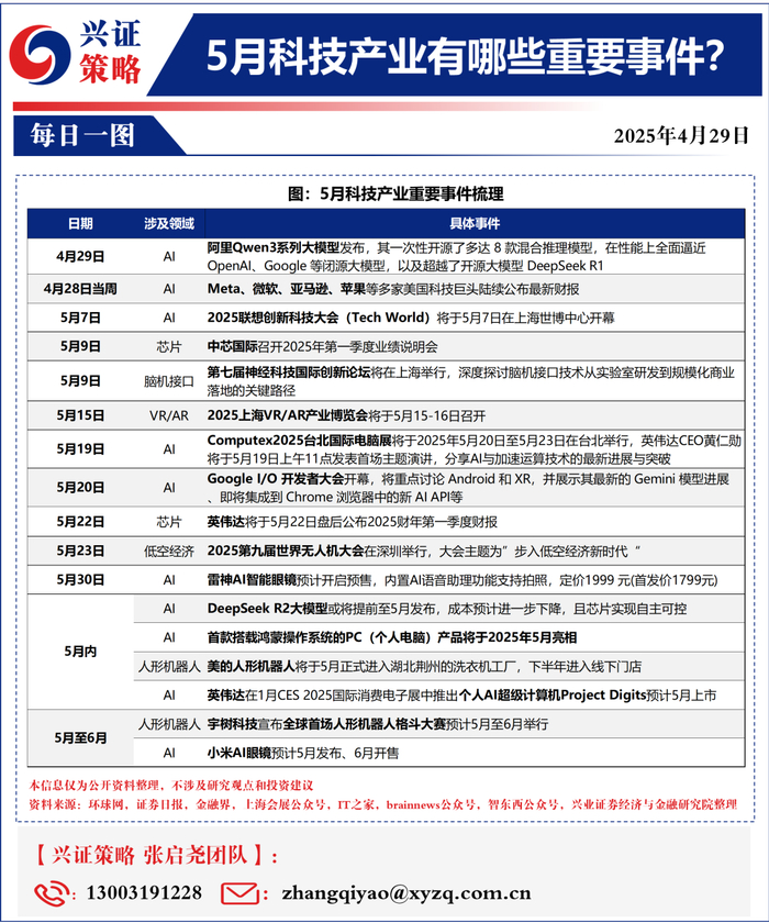我们在周报《5月科技风格会回归吗?》中提示,随着内部财报陆续披露,以及外部关税扰动正在逐步过去,我们认为科技成长的布局时点已在逐步临近。除了股价本身调整较多之外,新一轮科技成长行情离不开重要产业事件的催化。我们梳理了5月科技产业的重要事件,供投资者参考: