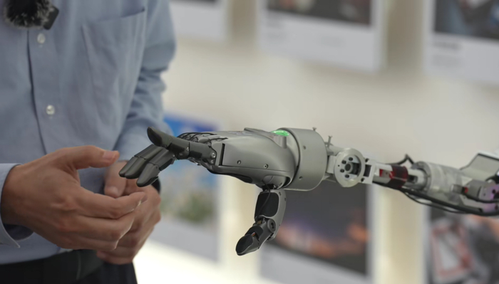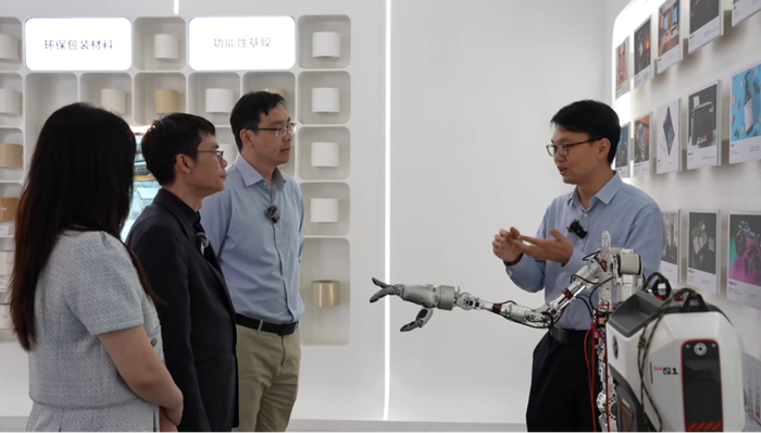 在福莱新材的展厅,陈书厅带嘉宾亲身与一只装有电子皮肤的机器灵巧手互动。这只灵巧手与人手大小无异。轻捏它的一个指尖,对应的手指就会快速翘起。
