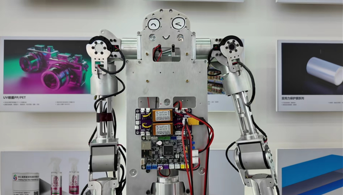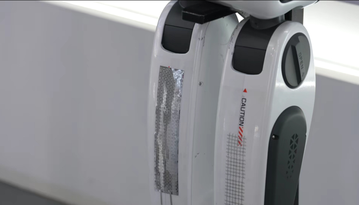 在灵巧手一侧,还立着一台众擎机器人,它的腿部同样贴着大片电子皮肤。陈书厅称,目前电子皮肤最基础的应用需求是在机器手指尖,因为指尖是抓握动作最常用的部位。进一步地可以延伸到整个手掌。未来,电子皮肤还有望应用在机器人容易发生碰撞的部位,比如膝盖、手肘、手背等,以增大机器人与人类交互的安全性。