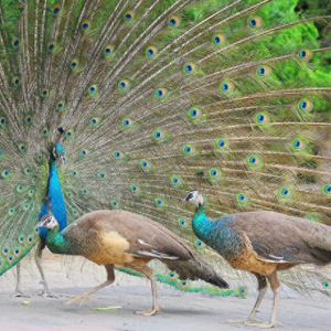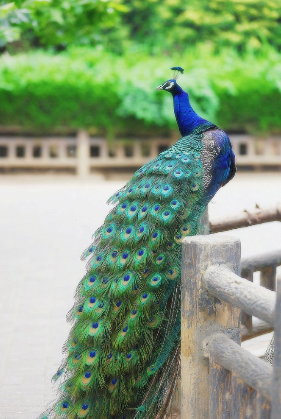 孔雀是最美丽的观赏鸟,是吉祥、善良、美丽、华贵的象征。世上共有两种孔雀:绿孔雀和蓝孔雀。大家所知的白孔雀和黑孔雀其实是蓝孔雀的变种。开屏的行为是它本身生殖腺分泌出的性激素、欲求偶繁衍同自己后代的效果。“五一”假期,正是欣赏孔雀正开屏的时候。