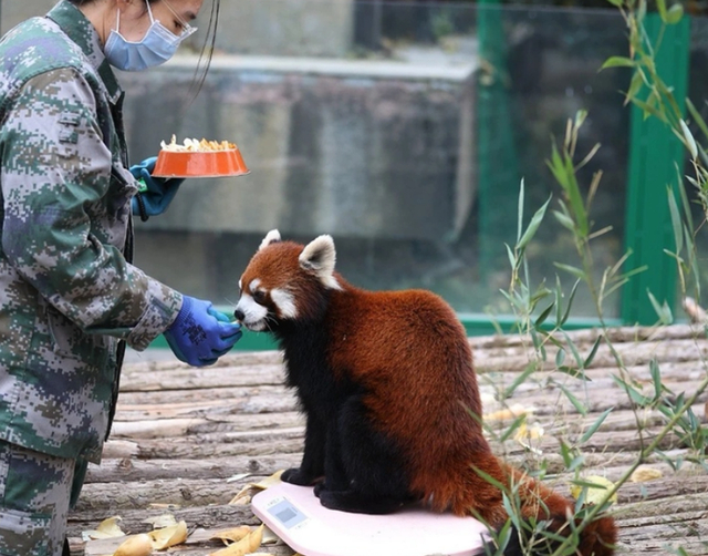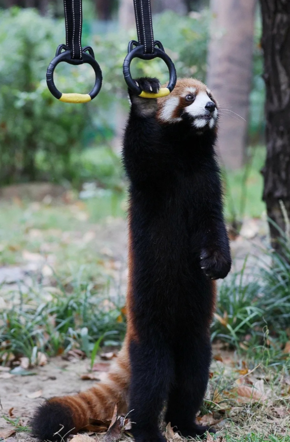 不过,呆萌可爱的“园宠”小熊猫可能更吸引小朋友们,它们不仅活泼可爱,还会“十八般武艺”,配合称体重、抓吊环……还有跟随、定点、进箱等动态训练。