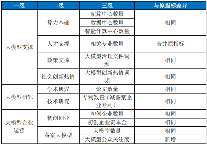 本报告延续前期大模型指数的指标框架,仍然从大模型研究、大模型实践和大模型支撑3个一级指标、8个二级指标构建指数。在末级指标上,对两项指标做了适当优化和调整,具体包括: