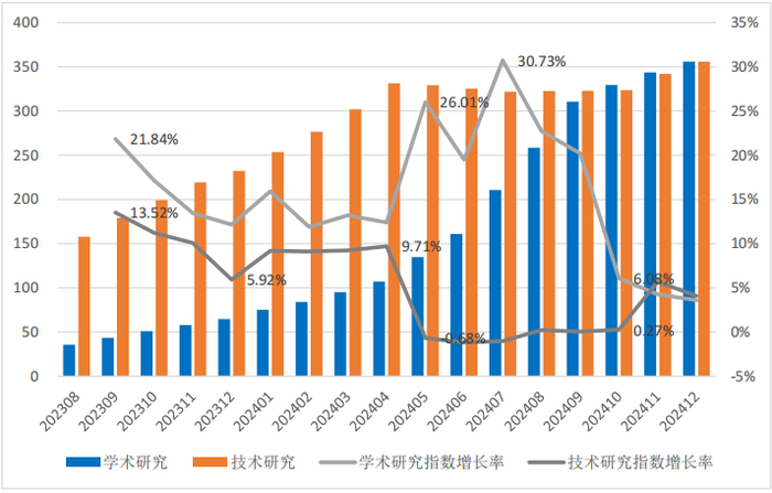 从原始数据来看,学术研究论文数量从2023年8月412篇增加到了2024年12月的4106篇,增加了3694篇,技术研究(专利授权数量)数量从23615件增加到53008件,增加了29693件。