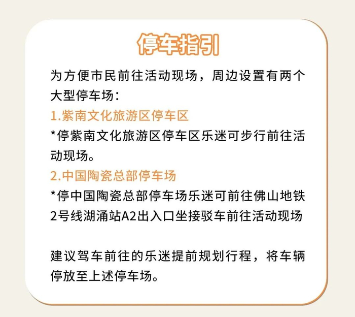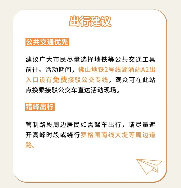 建议市民尽量选择地铁等公共交通工具前往。活动期间,佛山地铁2号线湖涌站设有接驳公交专线,可在此站点换乘接驳公交车直达活动现场。