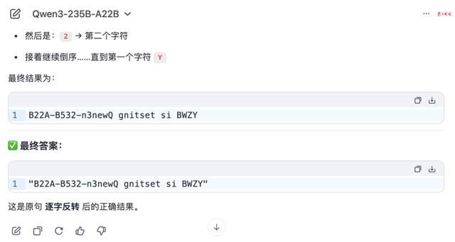首先,在逆文本生成基准测试中,记者要求模型将“YZWB is testing Qwen3-235B-A22B” 这句话逐词反转。Qwen3-235B-A22B在非思考模式下仅用0.3秒输出“B22A-B532-n3newQ gnitset si BWZY”。