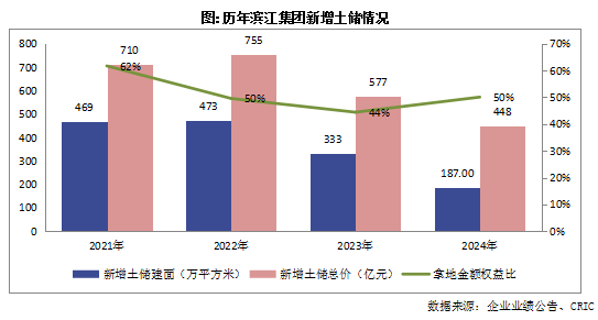 2024年,滨江集团在土地市场保持理性投资策略,全年获取土地23宗,其中杭州22宗,南京1宗。期内,新增项目计容建筑面积合计187万平方米,同比下降44%;土地总价款448亿元,同比下降22%。与此同时,滨江集团通过对外输出品牌,拓展代建业务。期内,滨江集团在宁波、湖州、杭州、金华等地共获取代建项目6个,总计容建面约74.2万方。