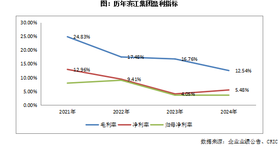 2024年滨江集团实现营业收入692亿元,同比下降2%。毛利润为87亿元,同比下滑27%,毛利率12.54%,同比下降4.22个百分点。毛利率较上年同期有所下降,是由于期内结算的主要项目为2020年、2021年获得的项目,该等项目因存在自持等原因导致毛利率较低,预计随着低毛利项目的交付,未来毛利率会逐步修复。