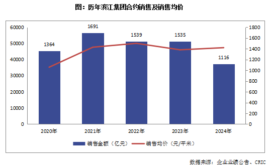 2024年滨江集团实现销售额1116.3亿元,同比下降27%,位列克而瑞《2024年中国房地产企业销售TOP200排行榜》全口径销售金额第9名,首次进入克而瑞全国房企TOP10阵营,排名较2023年提升2位,同时也成为TOP10中唯一的民营房企。全年合同销售面积236万平米,同比下降29%;销售均价47323元/平米,同比增长3%。