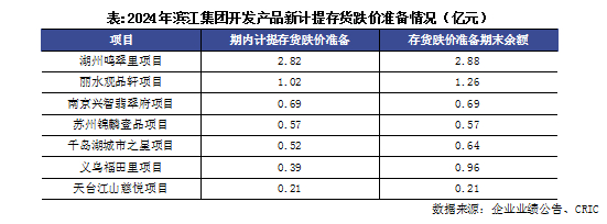 此外,期末滨江集团的存货账面余额为1525亿,存货跌价准备为40亿,期末存货账面价值1485亿。期内,滨江集团的存货跌价损失及合同履约成本减值损失为8.7亿。开发成本新计提了约3亿的跌价准备,开发产品新计提了约6.2亿。开发产品中,湖州鸣翠里新计提了2.82亿的存货跌价准备,该项目据悉2021年10月开工,2024年6月竣工。2024年湖州鸣翠里的预售均价为17160元/平米,相比2023年预售均价17890元/平米下跌了4%。
