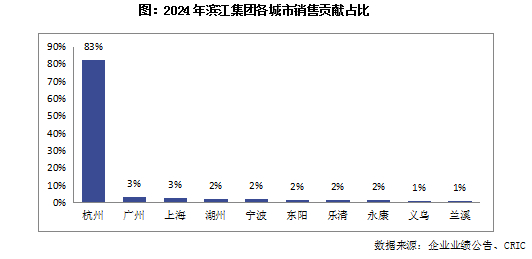 滨江集团长期聚焦杭州市场,2024年杭州一城的销售贡献占比达到了83%;而其他销售规模较高的城市,如广州、上海销售贡献占比仅为3%左右。