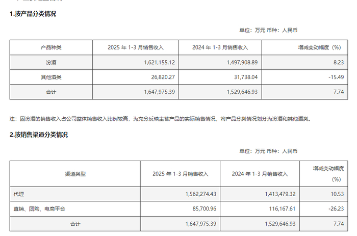 从产品分类来看,汾酒产品一季度实现营收162.12亿元,同比增长8.23%;其他酒类销售收入则同比有所下滑。而在渠道方面,代理渠道营收同比增长10.53%,虽然直销、团购、电商平台等渠道营收下滑26%,但渠道销售整体上仍然保持增长。