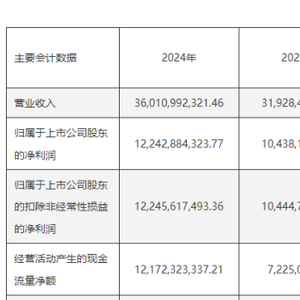 此外,公司还拟派发近44亿元的“大红包”,拟向全体股东每10股派发现金股利36元(含税)。截至2024年12月31日,公司总股本约为12.2亿股,以此计算合计派发现金股利约43.92亿元。本年度公司现金分红(包括中期已分配的现金股利)总额达73.93亿元,占本年度归属于上市公司股东净利润的比例为60.39%。