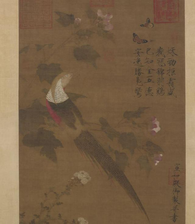 宋代赵佶《芙蓉锦鸡图轴》中,一只锦鸡落于芙蓉枝上,回首凝望着两只翩翩起舞的彩蝶,几枝菊花斜出,构成一幅生机盎然的秋景图。