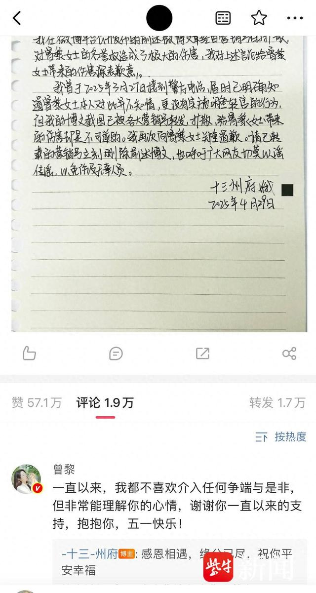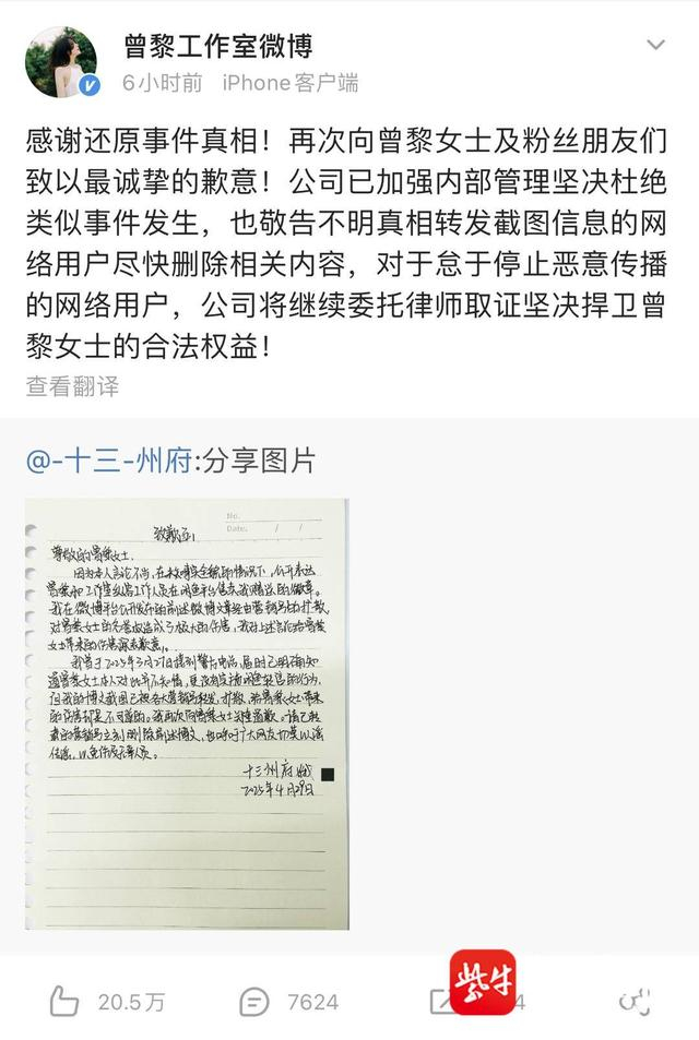 今天,该粉丝在网上发布手写道歉信,称自己“未知事实全貌”损害了曾黎名誉权,而工作室转发此信并感谢其“还原真相”,曾黎本人则以“抱抱你”等温情话语回应,最终粉丝以“缘分已尽”宣告脱粉。