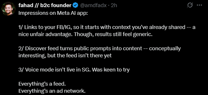 X用户认为Meta AI利用Facebook和Instagram的数据是个“狡猾”的优势,能直接获取用户上下文,但实际体验偏“普通”,结果不够个性化。他提到“Discover feed”功能有潜力,但目前体验不佳,隐约吐槽Meta“偷懒”没把功能做完善。