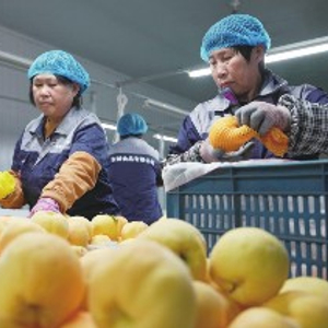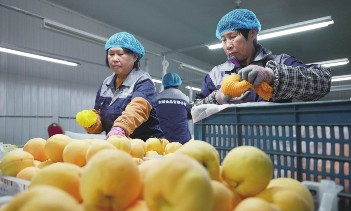 近年来,河北省昌黎县引导农民依托良好的自然生态环境和资源优势,因地制宜发展大棚桃、葡萄等设施果品种植,助农增收,助力乡村振兴。图为河北省昌黎县两山乡河西张各庄村东义果蔬种植专业合作社的社员在分拣刚采摘的鲜桃。新华社记者杨世尧/摄
