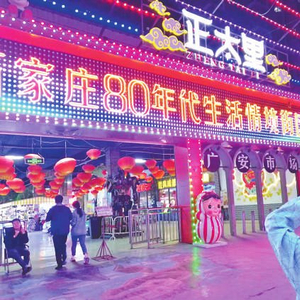 4月14日晚8时许,位于石家庄市泰华街的正太里文旅休闲街区灯光明亮、游人如织。“公社大食堂”里,牛肉板儿面、摇滚烤鸡等特色美食香气扑鼻,老电视、老自行车等老物件与港台明星老画报交织成20世纪80年代的时光画卷,小卖部、理发店、游戏厅的复古场景让人目不暇接。
