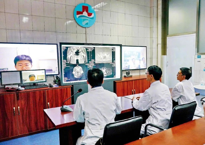 2019年12月3日,河北石家庄滦州市人民医院的医生,在“医共体”影像诊疗中心通过互联网与滦州市中医医院的大夫为患者会诊。图/新华