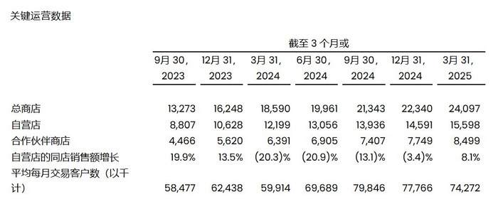 截止2025年一季度末,门店总数达24097家,本季度内净增门店1743家门店(含香港5家),环比2024年四季度开店速度再次加快。一季度月均交易客户数达7427万,同比增长24%。