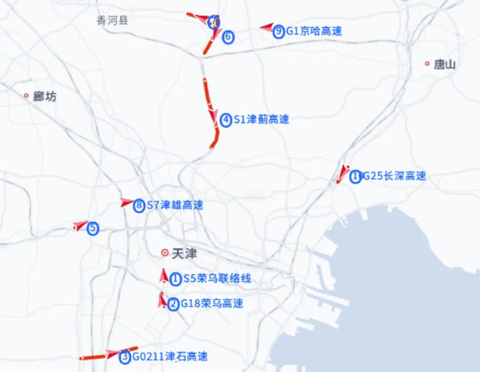 如果长深高速唐山段拥堵,可提前在汉沽北互通转入滨保高速,转入塘承高速,行至京哈新安镇站转入京哈高速进入唐山。