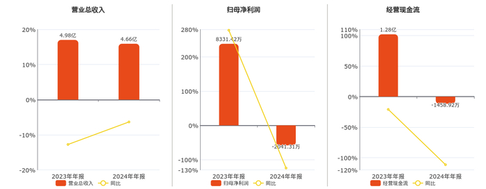 公司营业总收入为4.66亿元,在已披露的同业公司中排名第125,较去年同报告期营业总收入减少3160.32万元,同比较去年同期下降6.34%。归母净利润为-2041.31万元,在已披露的同业公司中排名第116,较去年同报告期归母净利润减少1.04亿元,同比较去年同期下降124.50%。经营活动现金净流入为-1458.92万元,在已披露的同业公司中排名第131,较去年同报告期经营活动现金净流入减少1.42亿元,同比较去年同期下降111.41%。