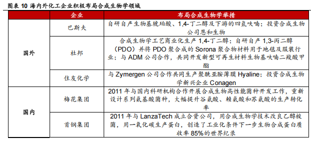 在实际产业落地过程中,当前化工企业纷纷布局合成生物学,产业转型升级在全球范围内已在进行中。在化工领域,合成生物学在生物基化学品的合成、生物材料、生物能源、现代农业、环境治理等领域有广泛的应用前景。近年来,合成生物学的技术进步不仅使一批合成生物学企业(例如:Ginkgo、Beam、Genomatica 等)得以成长,也令许多以传统化工、医药产品开发为主的企业(例如:BASF、Dupont 等)也将目光投向合成生物学,发展生物化工,开发出一系列生物基产品。目前合成生物学可合成的大宗化学品仅几十种,在整体基础化学品中的占比还非常有限,提升空间巨大。中短期内,产业内聚焦产品开发推广的应用层公司有望通过替代化学法更快实现生产盈利;而以技术研发、服务为主的平台层、工具层公司将在合成生物学行业生态建立起来后,通过更高效专业地为大量代工企业服务获利。
