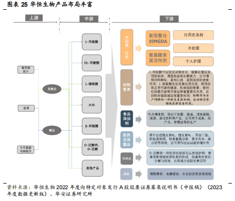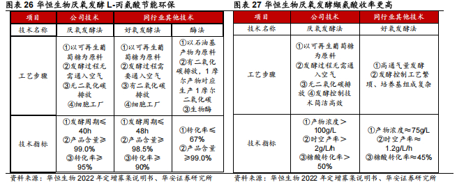 公司核心产品丙氨酸及缬氨酸采用厌氧发酵法技术生产,收率更高且环境友好。传统化学法合成丙氨酸存在产品质量差,合成路线长,收率低,成本高,环境污染重等缺点,目前基本被淘汰。酶催化法解决了化学法的高污染、低产率问题,是目前工业上主流方法,工艺以 L-天冬氨酸为原料,通过 L-天冬氨酸-β-脱羧酶转化成 L-丙氨酸。而华恒生物使用厌氧发酵法技术生产丙氨酸,以可再生葡萄糖为原料代替了传统的石油基原料,具有更加明显成本优势,原材料端支出受周期影响小,更加稳定,且发酵过程无需通入空气、无二氧化碳排放、发酵控制技术简洁高效,生产效率及毛利更高。公司采用酶法生产的β-丙氨酸制备 D-泛酸钙,基于公司现有核心产品丙氨酸的技术与成本优势基础上开发衍生物新产品,形成了自有业务的上下游产业链优势,生产成本更低。缬氨酸响应当前政策对食品安全的强调,下游主要应用于动物饲料、替代玉米、豆粕等提供动物必要氨基酸,随着国内非粮生物质开发需求增加、缬氨酸的需求也将持续扩大、属于增量市场,成长优势显著。