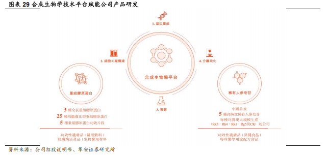 公司将合成生物学作为底层技术支撑和核心战略方向,通过合成生物技术生产透明质酸、麦角硫因等产品,成本降低、效率提高。微生物发酵法生产透明质酸技术是公司首席科学家郭学平博士及其团队在国内首创,替代了传统的动物提取法,实现透明质酸的规模化生产,改变了透明质酸在医药、食品、化妆品等多个领域的应用格局。公司也积极引进 AI 和机器学习技术,结合高通量筛选技术,在合成生物学领域实现菌株设计、构建和性状筛选、数据分析和生物系统建模、下游工艺开发优化的高效运转,以此提高项目开发转化效率和产品质量。