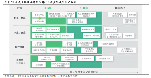 合成生物技术将在不同行业逐步完成工业化落地,应用场景逐渐打开。据《中国合成生物产业白皮书 2024》,近五年内,生物制造工业化成果将主要围绕各大领域中先发探索话题的散点突破,如化学和材料中的部分基础化学品及聚合物,农业和食品中的少数食品添加剂、植物蛋白及发酵蛋白作为替代蛋白,医疗保健中创新细胞和基因疗法、部分原料药合成,以及消费品中的部分功能性小分子和重组胶原蛋白技术等;五至十年内,生物制造将围绕各大领域的应用进一步拓展,并实现部分全新子品类的技术突破和规模化生产,如材料领域的高性能蛋白、食品领域的细胞培养蛋白、农业领域的共生固氮技术、医药领域的工程菌疗法等;超过十年的远期来看,合成生物学一方面有望在热门应用领域和目前科研尚处早期/技术瓶颈较大的话题上实现工业化跑通,如活体功能材料、光合作用优化、器官再生等,另一方面,也预期将在生物质燃料、环保等新领域进一步发挥作用。