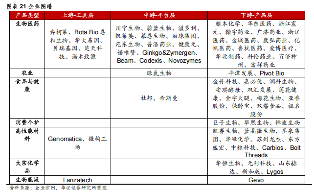 根据企业在产业链的上中下游方位与发展历程,合成生物学公司可分为:实现核心单品技术突破与商业化的公司,转型升级布局合成生物学的传统发酵公司,以及专精上游合成生物学技术的工具型与平台型公司。合成生物学未来将进入快速发展期,产业链投资速度继续加快,产品产业化也将提速。