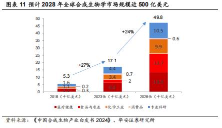 合成生物学产业发展不仅将替代部分传统发酵、传统化工工业行业应用场景,也会创造新的发展空间。合成生物学产业在过去五年经历了高速增长,据据 McKinsey 数据,合成生物学市场规模从 2018 年的 53 亿美元增长到 2023年的超过 170 亿美元,平均年增长率达 27%,预计全球合成生物学市场在可见的未来仍将保持较快发展势头,将在 2028 年成长为体量达近 500 亿美元的全球型市场。