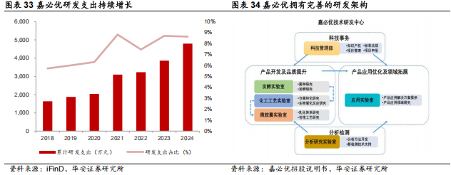 嘉必优从下游产品层向中游平台层布局,逐渐形成了以工业菌种定向选育、发酵精细调控、高效分离纯化制备等生物制造技术为基础的领先性平台化技术。公司拥有完善的研发架构,基于核心技术,公司在前端研发、工程化、产业化三个层面不断创新,建立了一系列技术产业链转化平台。2024 年公司将基于AI 发展,建设并完善合成生物学技术平台、完成武汉合成生物创新中心项目建设工程,与各个研发中心形成联动互补,发挥公司产业化能力,打造高效合成生物产业生态,提升研发成果转化能力。