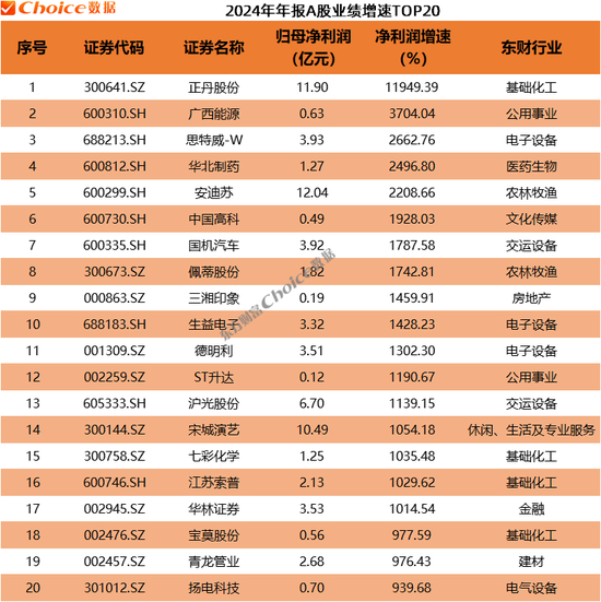 2024年,17家公司净利润增速超过10倍,业绩增速最快的是正丹股份,达到11949.39%;广西能源、思特威-W业绩增速分别为3704.04%、2662.76%。