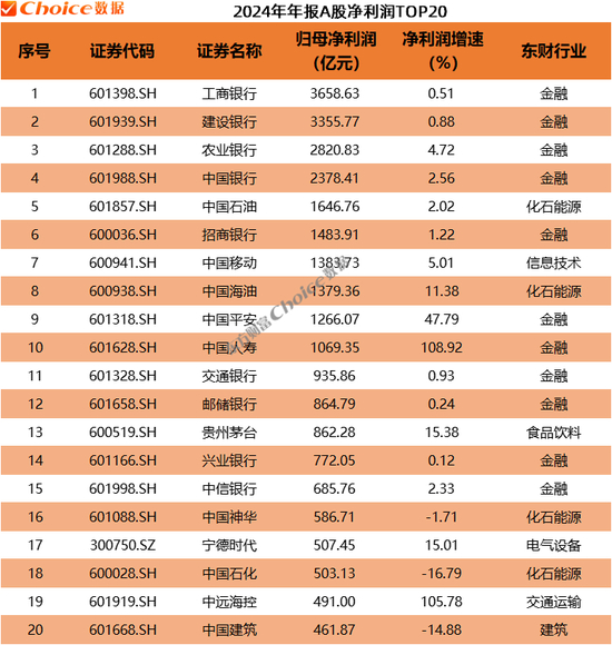 归母净利润方面,金融、石油行业占据榜单前六名,工商银行以3658.63亿元位居2024年A股利润榜首位;建设银行、农业银行、中国银行分别以3355.77亿元、2820.83亿元、2378.41亿元排名第二至第四。中国石油、招商银行、中国移动、中国海油、中国平安、中国人寿净利润均超过1000亿元。