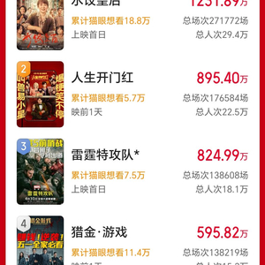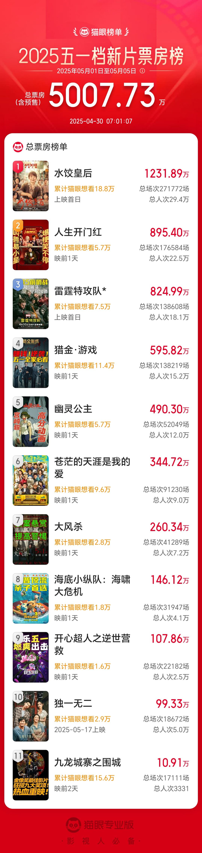 2025五一档新片总票房破5000万 界面新闻 界面新闻官方账号 2025.04.3008:07 关注 据猫眼专业版数据,截至4月30日7时01分,2025年五一档总票房(含点映及预售)破5000万,《水饺皇后》《人生开门红》《雷霆特攻队*》分列前三位。