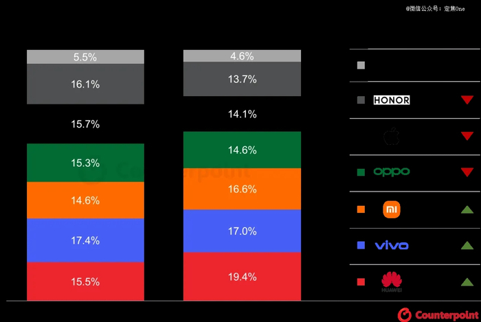 Counterpoint统计的是“销量”(Sell-Through),即终端经销商将手机实际卖到消费者手中的数量,约等于用户激活量(用户购买后不激活的占少数)。这份报告显示,2025年*季度销量份额*的厂商是华为(19.4%),第二是vivo(17%),小米(16.6%)排第三。